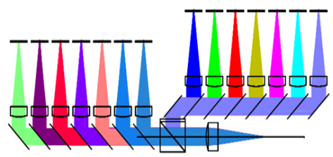 激光合束是一個(gè)將多束單元激光耦合成一束的過(guò)程,它基于半導(dǎo)體激光的相位、光強(qiáng)、偏振及光譜等特性,利用光學(xué)元件的折射、反射及衍射效應(yīng),改變或不改變激光單元的振蕩特性,來(lái)提高輸出功率、增加激光亮度及改善光束質(zhì)量。非相干合束是目前實(shí)現(xiàn)高功率半導(dǎo)體激光輸出的主要方式,可以根據(jù)合束光源的譜寬及合束單元的波長(zhǎng)間隔作為區(qū)分。