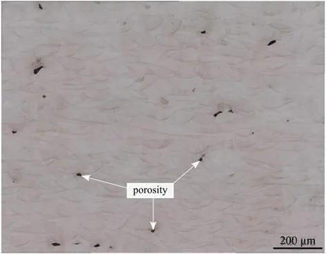孔隙率是LPBF工藝中常見的缺陷,對樣品機械性能有負面影響。通常,粉末擴散不足、缺乏熔融、鍵孔、收縮和氣體參與會形成孔隙。前三者類型尺寸較大,是由于工藝參數(shù)不當(dāng)造成的。例如,金屬粉末堆積密度低(例如,小于50%)和飛濺物可能導(dǎo)致粉末床中出現(xiàn)較大的孔隙,而這些孔隙在熔化過程中無法填充。高激光能量密度導(dǎo)致鍵孔,金屬蒸汽壓導(dǎo)致深熔池底部出現(xiàn)孔隙。通過優(yōu)化LBAM工藝參數(shù),可以完全消除這些缺陷。一般來說,后兩種類型的尺寸較小。由于凝固收縮導(dǎo)致的孔隙通常位于晶粒之間,并遵循晶界形狀。氣體誘導(dǎo)的孔隙呈球形,可能來自由于氣體霧化過程而捕獲在粉末原料顆粒中的氣體、由于不同溫度下不同的氣體溶解度而溶解在金屬中的氣體、熔化過程中產(chǎn)生的金屬蒸汽或粉末表面的水分。圖4為LBAM技術(shù)制備316 L不銹鋼的光學(xué)圖像。