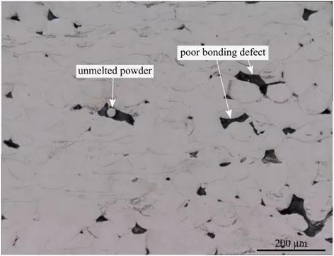 不完全熔合主要是由于LBAM工藝制備過程中缺乏能量輸入而產(chǎn)生的,也稱為缺乏熔合缺陷,如圖5所示。缺乏熔合缺陷主要是因為金屬粉末沒有完全熔化,在前一層上沉積了一層新的金屬粉末,它們之間有足夠的重疊。缺乏熔合缺陷可分為兩種類型:凝固過程中熔融金屬粉末不足形成的粘接不良缺陷和未熔化的金屬粉末造成的缺陷。