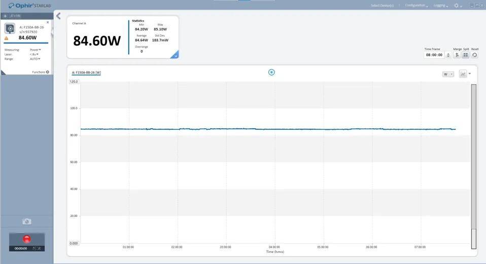 在工程實(shí)踐中,我們的二倍頻模塊對倍頻效率和中低功率的相位匹配條件做了保留,重點(diǎn)關(guān)注高功率注入下的綠光性能,這也符合后面四倍頻模塊有效諧波轉(zhuǎn)換的要求。處于系統(tǒng)穩(wěn)定性的考慮,對二倍頻激光功率穩(wěn)定性做了長時(shí)間的監(jiān)測,從實(shí)測數(shù)據(jù)看,其功率穩(wěn)定性優(yōu)于0.22%,8小時(shí)連續(xù)測量功率平均值84.6W(圖3)。