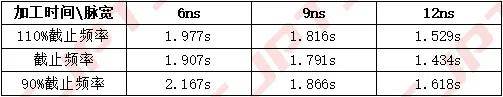 通過實驗可以得出結(jié)論,重復(fù)頻率為截止頻率時,加工效率最高,加工時間減小降低了熱量堆積,崩邊相比90%和110%最小,截止頻率以下時輸出平均功率低導(dǎo)致效率偏低,截止頻率以上時單脈沖能量和峰值功率下降導(dǎo)致效率偏低。