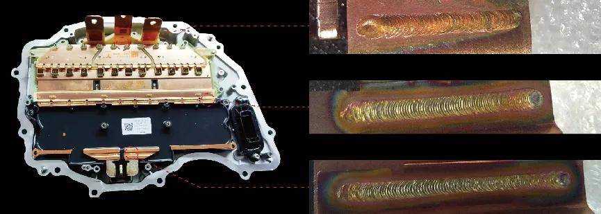 傳統(tǒng)激光焊接具有熱影響大、飛濺大等問(wèn)題,半導(dǎo)體器件有熱沖擊損傷和短路風(fēng)險(xiǎn)。而雙光束激光器憑借其在銅材加工方面超低飛濺的獨(dú)特優(yōu)勢(shì),以及其高穩(wěn)定性、高焊接速度等特點(diǎn),為逆變器等電控系統(tǒng)的小型化、集成化提供了強(qiáng)有力的支持。