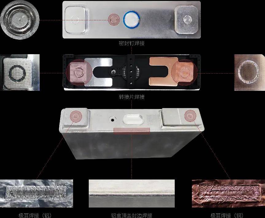 方形鋁殼鋰電池在制造組裝過(guò)程中,需要大量應(yīng)用到激光焊接工藝,例如:極柱焊接、轉(zhuǎn)接片焊接、極耳焊接、頂蓋封口焊接、密封釘焊接等等。