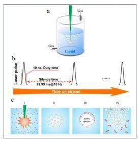 圖1. (a) LBL裝置簡圖;(b)脈沖激光的作用周期示意圖 ;(c)單個(gè)激光脈沖周期內(nèi)微氣泡的演化過程示意圖。