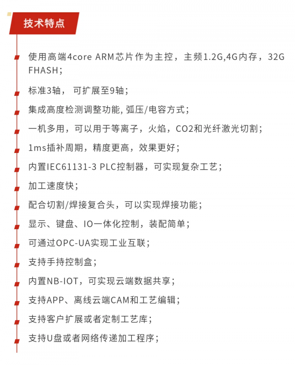 3、加工速度快,功能豐富,配合切割/焊接復(fù)合頭,可以實(shí)現(xiàn)激光焊接、激光切割以及等離子、火焰切割等功能。此外,還可通過OPC-UA實(shí)現(xiàn)工業(yè)互聯(lián),進(jìn)行多角度曲面切割。傳統(tǒng)系統(tǒng)只有單一功能,或切割、或焊接。大族光子水冷三合一解決方案可擴(kuò)展至9軸,一機(jī)多用,性價比高,可以用于等離子切割、火焰切割、CO2桌面型切割/打標(biāo)機(jī)、激光切割以及平臺焊接控制系統(tǒng)等領(lǐng)域,節(jié)省人工,提高效率。此外,方案可實(shí)現(xiàn)1ms插補(bǔ)周期,精度更高,應(yīng)用效果更好,可輕松應(yīng)對各種金屬材質(zhì)的厚薄板切割加工。基于大族光子技術(shù)平臺的研發(fā)優(yōu)勢,方案中內(nèi)置的新一代高亮度單模光纖激光器產(chǎn)品采用976nm泵浦技術(shù)高效賦能,電光效率最高達(dá)45%,將激光器卓越性能提升至全新高度——理想的光束質(zhì)量、卓越的可靠性,以及高電光轉(zhuǎn)換效率,以及在應(yīng)對高反材料方面表現(xiàn)尤為出色,可以為市場實(shí)現(xiàn)更可靠、更高效、更高品質(zhì)的焊接及切割加工質(zhì)量。