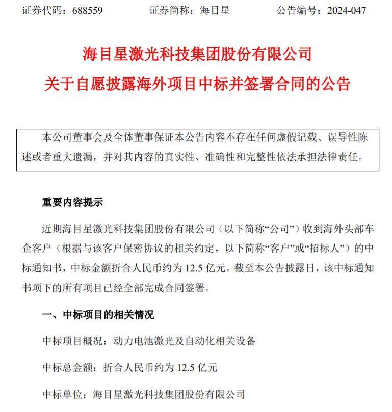 8月8日晚間,海目星發(fā)布重磅公告稱,公司已于近日中標(biāo)海外頭部車企客戶的動力電池激光及自動化相關(guān)設(shè)備采購項目,合計中標(biāo)金額約12.5億元,占公司2023年營業(yè)收入的26%。截至目前,該12.5億元的中標(biāo)項目均已完成合同簽署。