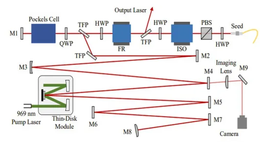 再生放大作為一種激光放大方案,由于其對種子光進行多次放大的特點具有極高的增益,脈沖能量放大倍率可達106-107倍,同時諧振器的存在也能夠保證輸出光的基模特性,能夠?qū)崿F(xiàn)較高光束質(zhì)量的激光輸出[8, 9]。 再生放大結(jié)構(gòu)主要包含: (1)普克爾盒:通過加壓與不加壓調(diào)節(jié)種子光偏振態(tài),實現(xiàn)對種子光輸入、輸出的控制;