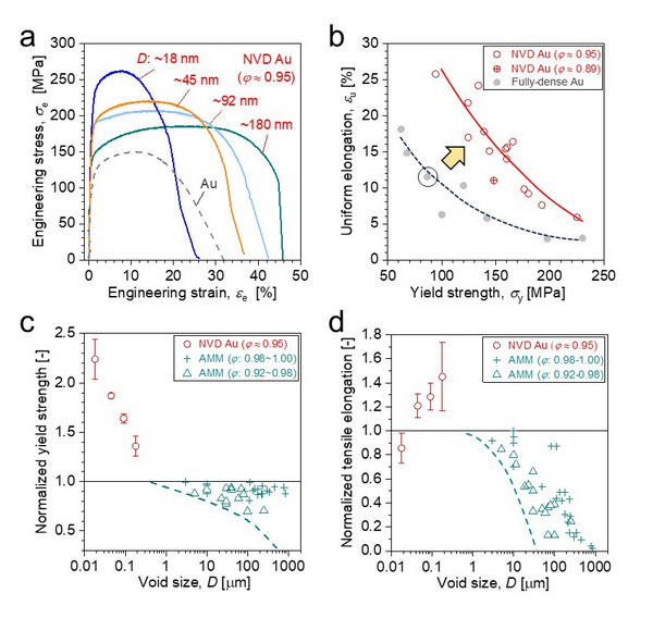 納米孔彌散強化金(NVD Au)的力學行為:(a)不同孔徑NVD Au以及全致密參比樣品的拉伸曲線;(b)兩種樣品均勻延伸率隨屈服強度的變化;(c)屈服強度和(d)均勻延伸率隨孔徑的變化規(guī)律。AMM: 增材制造金屬材料。屈服強度和均勻延伸率均以相應(yīng)全致密態(tài)樣品數(shù)據(jù)為基準進行了歸一化。