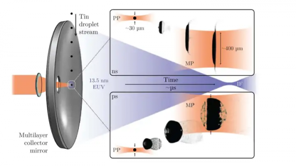 Cymer的LPP整體方案顯得十分魔幻。首先選中了德國(guó)通快公司的極高功率CO2紅外激光,其波長(zhǎng)是10.6um,最適合錫等離子體通過(guò)逆韌致輻射吸收效應(yīng),吸收大量激光的能量,從而有助于升溫并電離。其次采用預(yù)脈沖激光技術(shù)顯著提高EUV光源轉(zhuǎn)換效率。錫液滴的直徑為20微米,而主脈沖二氧化碳激光器光斑直徑至少為幾百微米,為了解決液滴尺寸和激光光斑尺寸的不匹配問(wèn)題,先用小功率預(yù)脈沖激光照射錫液滴使其升溫膨脹,受光面積變大。緊接著主脈沖激光再次精確轟擊這個(gè)餅狀的錫滴將其形成等離子體,并產(chǎn)生EUV輻射。為了保證光源的連續(xù)性,1秒鐘需要精確“狙擊”5萬(wàn)個(gè)20微米的錫液滴。這樣很容易將激發(fā)轉(zhuǎn)換效率從1%提升到5%,也就是將EUV光源功率增加5倍。如果單純提升紅外激光器的功率,意味著要將40千瓦的紅外激光平均功率提升到200千瓦,那幾乎是不可能的任務(wù)。