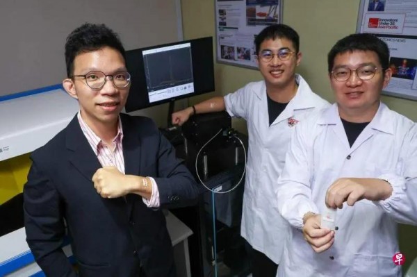 新加坡南洋理工大學(xué)研究團(tuán)隊(duì)展示他們研發(fā)的創(chuàng)可貼型穿戴薄膜水凝膠激光器。