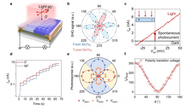 圖1. a. 器件結(jié)構(gòu)示意圖;b. MoTe2調(diào)控前后的偏振二次諧波測(cè)試結(jié)果;c. 器件在暗態(tài)和光照下的輸出特性曲線;d. 器件在0偏壓下的偏振光響應(yīng);e. 器件在不同偏壓下的偏振光響應(yīng);f. 在極性轉(zhuǎn)變點(diǎn)對(duì)應(yīng)的偏壓處,器件的偏振探測(cè)比超過(guò)300