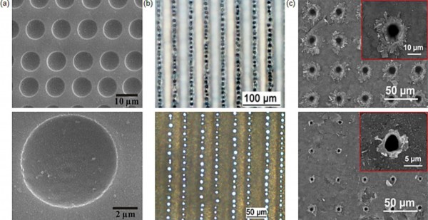 圖2.(a)飛秒激光燒蝕PDMS表面的SEM圖像。(b)飛秒激光輻照鋁表面的SEM圖像。(c)飛秒激光燒蝕電極材料制備的微孔陣列的SEM圖像(石墨烯-40的上下表面)。