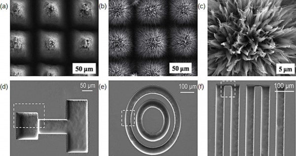 圖3.(a)飛秒激光輻照鈦表面產(chǎn)生的柱狀陣列。通過(guò)(b)化學(xué)處理和(c)退火獲得的三維結(jié)構(gòu)。通過(guò)飛秒激光微加工和退火,在PMMA表面生成了三種三維圖案:(d)由矩形凹槽連接的兩個(gè)凹槽;(e)同心圓;(f)一端部分連接的周期性矩形凹槽。