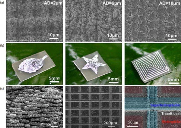 圖4.(a)飛秒激光處理后PDMS表面的SEM圖像。(b)不同形狀的液態(tài)金屬圖案,如樹(shù)葉圖案、星形圖案和螺旋圖案。(c)通過(guò)飛秒激光燒蝕鈦表面獲得的方形矩陣圖案結(jié)構(gòu)的SEM圖像。