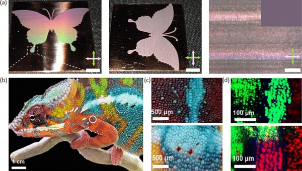 圖6.(a)從不同方位角(垂直和水平)拍攝的飛秒激光處理過(guò)的銅表面的照片和局部放大圖。 (b)變色龍的圖像。(c)變色龍皮膚的高倍放大圖像(與B中的圓圈部分相對(duì)應(yīng))。(d)仿生變色龍皮膚的全色熒光圖像。