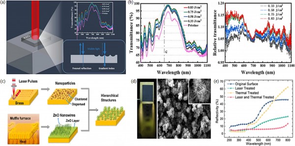 圖7.(a)飛秒激光加工AZO薄膜以形成可提高反射率的納米孔陣列示意圖。(b)原始AZO薄膜的透射率和相對(duì)透射率與波長(zhǎng)的函數(shù)關(guān)系,以及飛秒激光加工后AZO薄膜的透射率和相對(duì)透射率。(c)飛秒激光誘導(dǎo)和熱氧化黃銅片示意圖。(d)飛秒激光誘導(dǎo)和熱氧化黃銅片表面的照片和相應(yīng)的SEM圖像。(e)用不同方法加工黃銅片后反射率的變化示意圖。