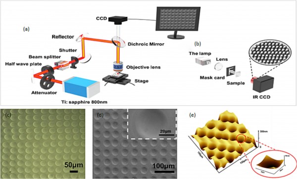 圖8.(a)利用飛秒激光在硫系玻璃As2Se3上制作微透鏡陣列的過(guò)程示意圖。(b)簡(jiǎn)化的紅外光學(xué)成像裝置。(c)利用飛秒激光輻照As2Se3制備的微透鏡陣列的光學(xué)顯微鏡圖像。(d)利用飛秒激光輻照As2Se3制備的微透鏡陣列的SEM圖像。(e)利用飛秒激光輻照As2Se3制備的微透鏡陣列的三維輪廓圖像。