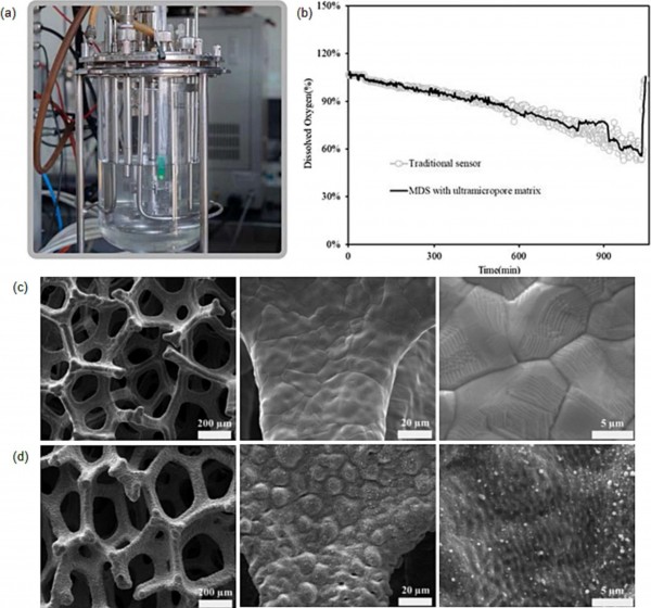 圖10.(a)實(shí)驗(yàn)裝置中的MDS示意圖。(b)傳統(tǒng)傳感器與超多孔基質(zhì)MDS的溶解氧信號(hào)對(duì)比。(c)未加工的泡沫銅和(d)激光處理過(guò)的泡沫銅的SEM圖像。