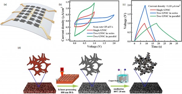 圖11.(a)柔性襯底上不同連接類(lèi)型的集成石墨烯超級(jí)電容器(GNSC)示意圖。(b)GNSC在電壓掃描速率為 25 mV/s時(shí)的CV結(jié)果。(c)電流密度為0.5mA/cm2時(shí)GNSC的GCD結(jié)果。(d)CuO/Cu超級(jí)電容器的制備工藝示意圖。