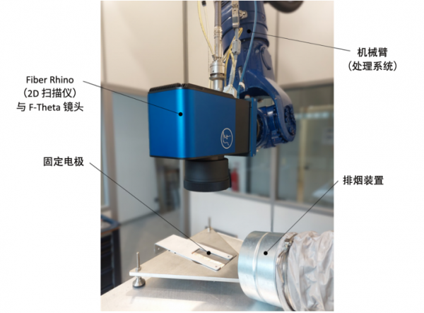 圖 7 展示了實(shí)驗(yàn)配置,即將 163 mm F-Theta 鏡頭和 CW 光纖激光器搭配使用,并將其與機(jī)械臂處理系統(tǒng)相連。