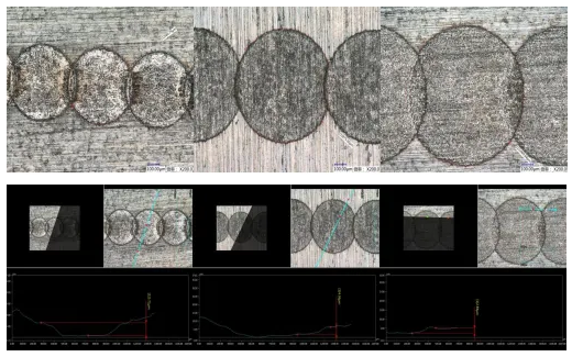 表2為P1000H-P與某進口激光器毛化效果對比,設置兩組點距和線距分別為0.4mm/0.8mm和0.4mm/0.4mm,從微觀效果圖對比可以看出兩款激光器毛化光斑分布均勻一致,熔池形態(tài)一致,經(jīng)3D顯微鏡測量300倍下兩款激光器在相同點線距下Ra值和Rz值相差不大,經(jīng)C公司涂覆驗證,P1000H-P批量毛化試片均達到檢測要求,由此可以得出,P1000H-P在鋁制電芯毛化應用上完全可以替代進口,為儲能企業(yè)降低生產(chǎn)成本。表2 1000H-P激光器與某進口脈沖激光器鋁殼毛化效果對比