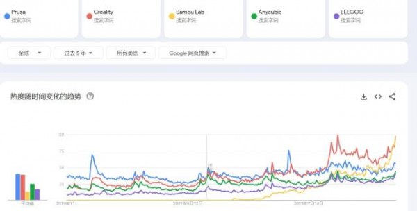最近5年前5家企業(yè)的谷歌搜索熱度值,拓竹后來(lái)居上。