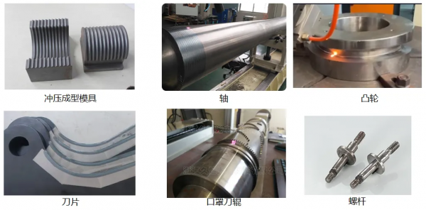 對(duì)于零件局部淬火,傳統(tǒng)加工方法為火焰淬火或感應(yīng)淬火,火焰淬火和感應(yīng)淬火均需要淬火介質(zhì),且感應(yīng)淬火需要制作相應(yīng)的工裝,對(duì)于復(fù)雜零件,其工裝制作成本和難度較大?;诖?,激光淬火有顯著的優(yōu)勢(shì),具體見圖1。同時(shí)基于固態(tài)相變重結(jié)晶強(qiáng)化機(jī)理作用,激光淬火層硬度、耐磨性和韌性均優(yōu)其他于傳統(tǒng)淬火層。從激光淬火的市場(chǎng)應(yīng)用來(lái)看,該技術(shù)目前主要用于汽車模具、刃具、鋼軌、發(fā)動(dòng)機(jī)缸體等的加工,圖2為典型的激光淬火零件。