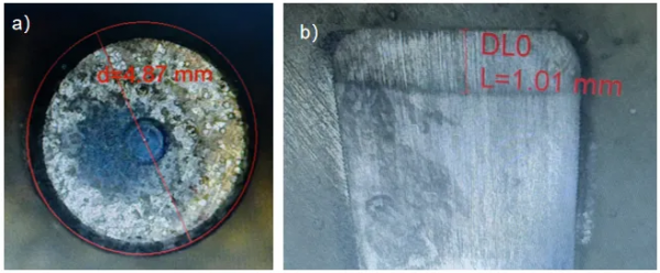 圖6為45號(hào)鋼零件軸的外形圖,該零件直徑為5mm,長(zhǎng)度20mm,需要對(duì)軸端面進(jìn)行淬火,表面硬度大于45HRC,淬火深度不小于1mm。由于零件尺寸太小,傳統(tǒng)的表面淬火無(wú)法精準(zhǔn)的控制加熱區(qū)域,很容易造成零件整體硬度偏高,而激光淬火因能精準(zhǔn)控制加熱區(qū)域和加熱時(shí)間,能很好的控制淬火質(zhì)量。采用機(jī)器人搭配準(zhǔn)直聚焦淬火頭以及銳科CL系列6000W(600μm)光纖激光器進(jìn)行淬火測(cè)試,采用定點(diǎn)加熱的方式完成淬火,加熱時(shí)間僅為3s,激光功率800W。圖7為零件淬火后表面和淬火層形貌和深度測(cè)試結(jié)果,零件淬火表面硬度為55HRC,淬火層深度為1mm,滿足技術(shù)要求。