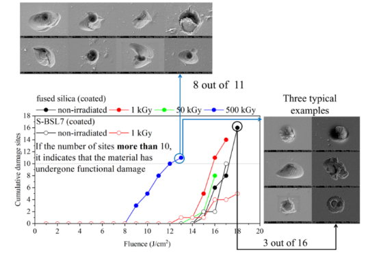 研究團(tuán)隊(duì)采用等效低軌、中軌和高軌劑量的伽馬射線對(duì)典型基底材料(熔石英和S-BSL7玻璃)以及激光薄膜元件(532nm反射膜)開展地面模擬試驗(yàn)。研究結(jié)果顯示,S-BSL7玻璃在低軌對(duì)應(yīng)劑量下即發(fā)生暗化,熔石英玻璃只在高軌對(duì)應(yīng)劑量下出現(xiàn)E’色心,但這兩種變化并未明顯影響基底拋光表面的激光損傷閾值;同時(shí)發(fā)現(xiàn),鍍制在這兩種基底上的高反射膜的光學(xué)性能并未受到輻照劑量影響,但高軌對(duì)應(yīng)劑量輻照導(dǎo)致激光薄膜的抗激光損傷能力出現(xiàn)明顯下降。研究重點(diǎn)解析了高軌劑量誘導(dǎo)激光薄膜抗激光損傷能力下降的影響途徑是薄膜中存在的缺陷,并采用蒙特卡洛模擬分析了高能射線誘導(dǎo)的二次電子在缺陷區(qū)域的聚集特征,從實(shí)驗(yàn)和理論分析兩方面對(duì)結(jié)果進(jìn)行了確認(rèn)。該研究工作首次闡明了伽馬射線與激光共同作用于激光薄膜元件的基本物理圖像,確定了作用點(diǎn)和作用機(jī)制,為空天激光用激光薄膜元件的早期失效篩選提供了方案,對(duì)于空天激光器的長壽命性能保障具有重要價(jià)值。
