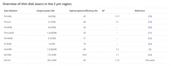 表 1:2μm 區(qū)域薄片激光器概覽。資料來源:Bingying Lei, Liyi Zhang, Sen Yang 等人,《Near diffraction-limited in-band pumped Ho:YLF composite thin disk laser at 2 μm》,《Optics Express》(2025)。