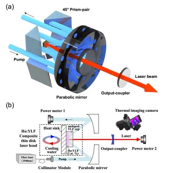 圖 2:Ho:YLF 薄片激光器示意圖。(a) 基于 12 路泵浦模塊的薄片激光器 3D 示意圖。(b) 實(shí)驗(yàn)裝置圖,顯示帶有水冷散熱器的復(fù)合薄片激光頭。資料來源:Bingying Lei, Liyi Zhang, Sen Yang 等人,《Near diffraction-limited in-band pumped Ho:YLF composite thin disk laser at 2 μm》,《Optics Express》(2025)。