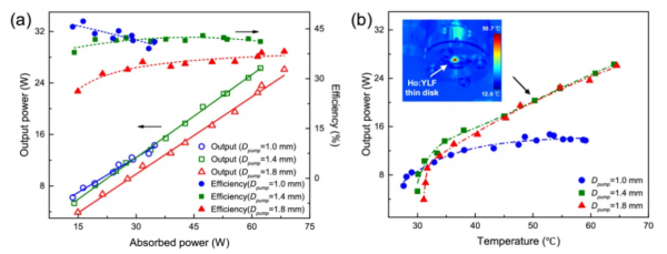 圖 4. 使用 3% 透射率 OC 測量的 Ho:YLF 薄片激光器輸出功率。資料來源:Bingying Lei, Liyi Zhang, Sen Yang 等人,《Near diffraction-limited in-band pumped Ho:YLF composite thin disk laser at 2 μm》,《Optics Express》(2025)。