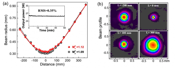 圖 6:輸出光束質(zhì)量。(a) 26W 輸出光束質(zhì)量的 M2 測量。(b) 不同距離(L = -200mm、0mm、100mm 和300mm)下的光束輪廓。資料來源:Bingying Lei, Liyi Zhang, Sen Yang 等人,《Near diffraction-limited in-band pumped Ho:YLF composite thin disk laser at 2 μm》,《Optics Express》(2025)。