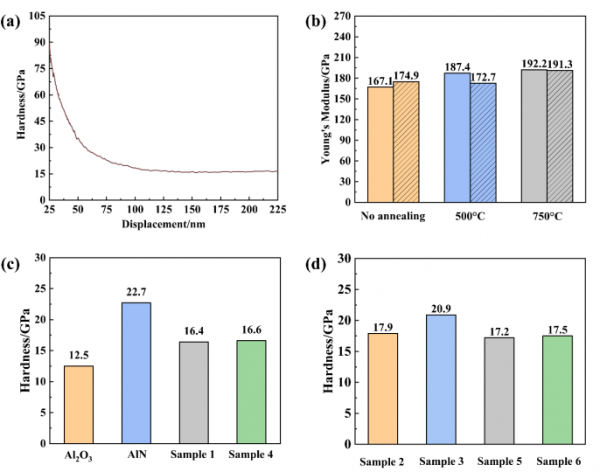 圖2.樣品的納米壓痕表征結(jié)果.(a)樣品4納米壓痕測量的硬度-位移曲線;(b)退火前后薄膜系統(tǒng)1和薄膜系統(tǒng)2(斜線)的楊氏模量測量值;(c) 未退火情況下測量的Al2O3、AlN和多層膜的硬度;(d) 退火后測量的樣