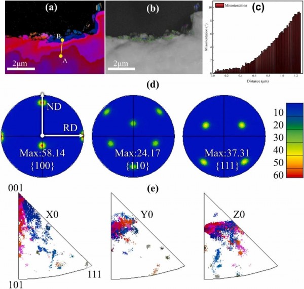 水導(dǎo)激光加工展現(xiàn)出了能夠?qū)崿F(xiàn)精確加工的能力,由于水射流的冷卻作用,其熱損傷有所降低。激光與水射流之間的相互作用引發(fā)了周期性的熱應(yīng)力,從而在重熔層表面形成了脊?fàn)罱Y(jié)構(gòu)。水射流中的氧擴(kuò)散導(dǎo)致重熔層內(nèi)形成氣泡,且氣泡密度隨著與界面距離的增加而減小。微觀結(jié)構(gòu)檢查揭示了不同程度的氧化現(xiàn)象以及析出相的存在,確定了多晶區(qū)域和非晶區(qū)域。晶體結(jié)構(gòu)的變化包括形成了β-NiAl多晶晶粒,其取向與基體略有不同。水射流施加的機(jī)械應(yīng)力影響了重熔層的表面取向,使其與水射流的運(yùn)動(dòng)方向一致?! ?/p>