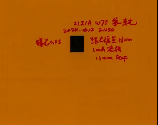 看到第一束光打出的黑斑,現(xiàn)場躁動(dòng)起來,有人遞給董宇輝一支紅色馬克筆,讓他在膠片上寫點(diǎn)東西。他拔下筆帽,在黑色光斑周圍寫下:“21I1A,W73,第一束光;2024.10.12,21:30;曝光0.1s(秒);距光源點(diǎn)330m(米)……”