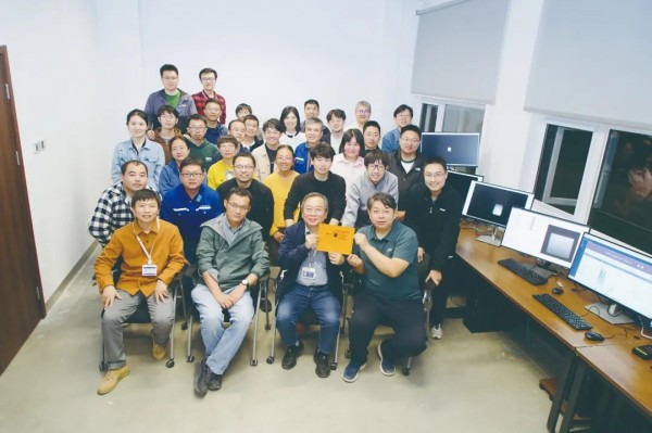 做完記錄后,董宇輝和在場的30多位實(shí)驗(yàn)人員,舉起帶黑斑的橙色膠片,拍了張合影。合影里的橙色膠片和一張張笑臉,成為這個(gè)高能同步輻射光源新里程碑的標(biāo)志。