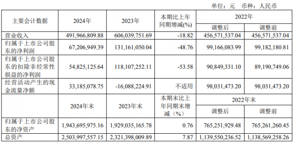 華曙高科2024年度實現(xiàn)營業(yè)收入4.92億元,同比下降18.82%;歸屬于上市公司股東的凈利潤6720.69萬元,同比下降48.76%;歸屬于上市公司股東的扣除非經(jīng)常性損益的凈利潤5482.51萬元,同比下降53.58%。