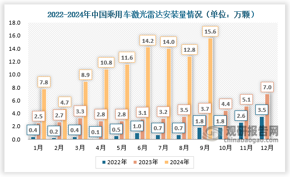 從安裝量來看,2024年前三季度,我國乘用車激光雷達累計交付量高達100萬顆,同比大增兩倍;2024年9月我國乘用車激光雷達安裝量為15.6萬顆,較去年同期大增四倍。