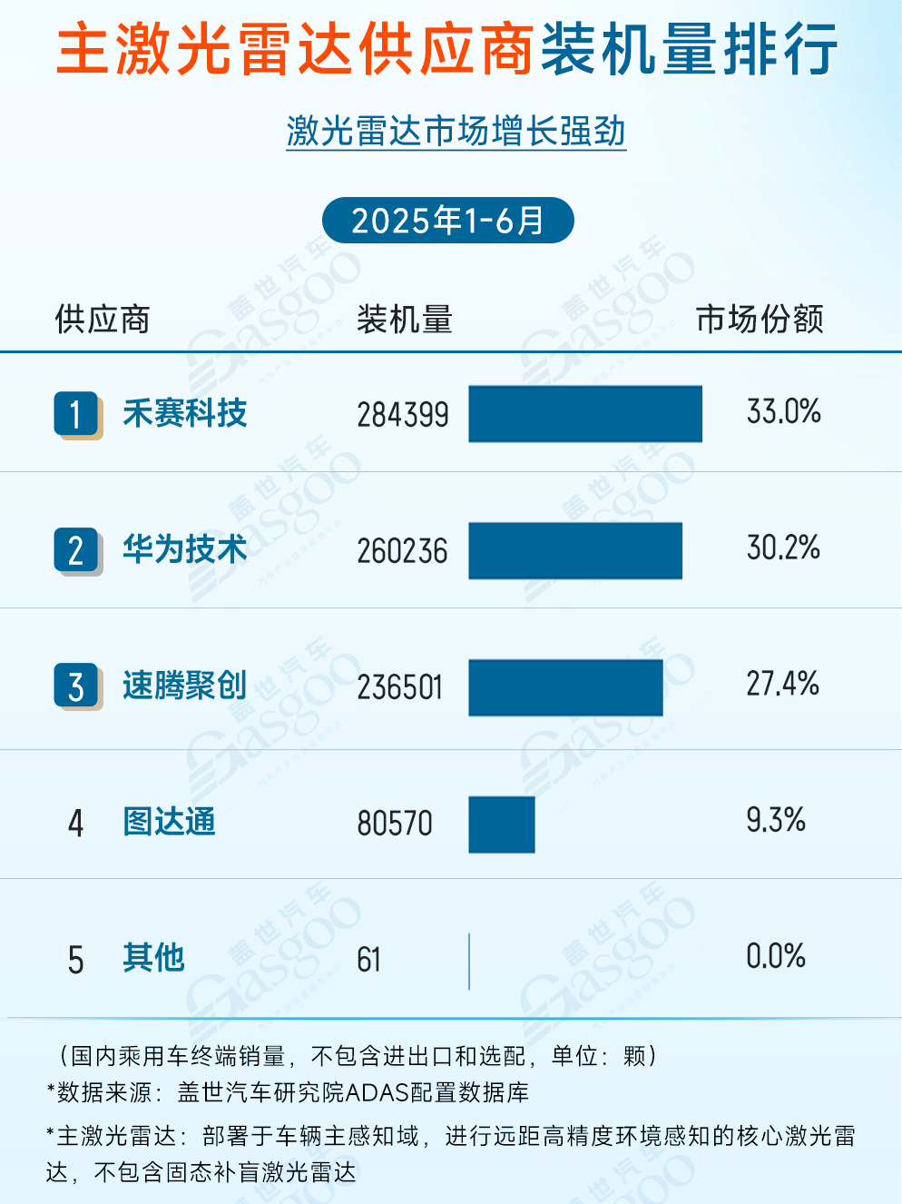 其中,主激光雷達(dá)(承擔(dān)核心環(huán)境感知任務(wù)的設(shè)備)總裝機量達(dá)861767顆,禾賽科技以284399顆、33.0%的份額位居榜首;華為以30.2%緊隨其后;而此前穩(wěn)居行業(yè)前三的速騰聚創(chuàng),則以27.4%的份額滑落至第三。