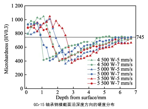 軸承是現(xiàn)代機械工程和設(shè)備中至關(guān)重要的組成部分,它在航空、汽車、高速列車等行業(yè)中發(fā)揮著重要作用。高速列車軸承的服役條件較特殊,工作時需要承受極高的轉(zhuǎn)速和相應(yīng)的離心力,運行過程中會受到?jīng)_擊、腐蝕及高溫的作用。高速列車軸承長期受到周期交變應(yīng)力的作用,其疲勞損傷成為其最常見的損傷形式,通常發(fā)生在軸承的滾動體與滾道之間。該損傷形式主要因為重復(fù)的應(yīng)力作用,材料逐漸疲勞,最終形成微小裂紋,這些裂紋隨著時間的推移而擴(kuò)大,導(dǎo)致軸承失效。為了提升高速列車軸承的使用壽命,需對其表面進(jìn)行強化處理。目前,軸承強化處理以傳統(tǒng)爐內(nèi)熱處理為主,該種方式難以同時保障表面的高硬度和心部的高韌性,且其能源消耗較大。激光表面處理技術(shù)具有傳統(tǒng)方法不可比擬的優(yōu)勢,可獲得比常規(guī)爐內(nèi)熱處理、感應(yīng)熱處理更高的硬度,進(jìn)一步提高其表面性能,同時不會改變心部韌性,故成為高速列車軸承表面性能提升的有效途徑。GCr15 軸承鋼是高速列車軸承常用的材料,其淬透性強,采用常規(guī)激光淬火技術(shù)形成的硬化層深度一般在1 mm以內(nèi),難以滿足 GCr15 高速列車軸承深層強化的需求。本文采用深層激光固態(tài)相變技術(shù)對GCr15 軸承鋼進(jìn)行表面強化處理,以期提高GCr15軸承鋼的表面硬度和強化層深度。通過控制工藝參數(shù)得到不同深度的強化層,并采用線接觸圓盤式滾動接觸疲勞測試裝置進(jìn)行疲勞實驗,研究其疲勞損傷機理,探討強化層深度對滾動接觸疲勞性能的影響,擬為GCr15 軸承鋼的表面強化提供參考。