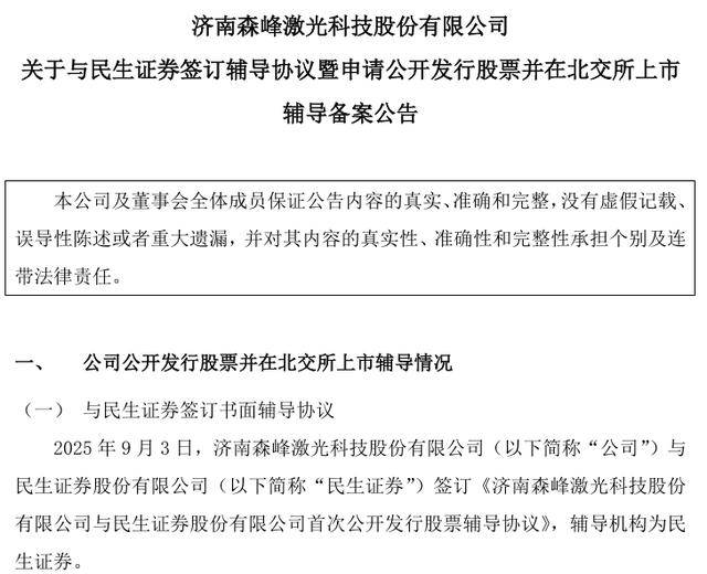 近日,濟南森峰激光科技股份有限公司(下稱“森峰激光”)在山東證監(jiān)局進行了IPO輔導(dǎo)備案登記,目標北交所,再次向資本市場發(fā)起沖刺。
