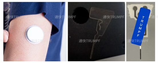 隨著可穿戴式持續(xù)血糖監(jiān)測儀(CGM)等設(shè)備對微型化和長壽命穩(wěn)定供電的需求不斷提升,其內(nèi)部電極等微型器件的精密切割面臨更大挑戰(zhàn)。通快紫外飛秒激光技術(shù)再次展現(xiàn)其獨(dú)特優(yōu)勢。在加工PET等敏感材料時(shí),其短脈沖、短波長特性可確保材料在高吸收率狀態(tài)下被精密切割,同時(shí)有效避免毛刺、碳化等熱損傷問題,保障器件的性能與長期可靠性,滿足可穿戴健康設(shè)備日益提升的精密制造需求。