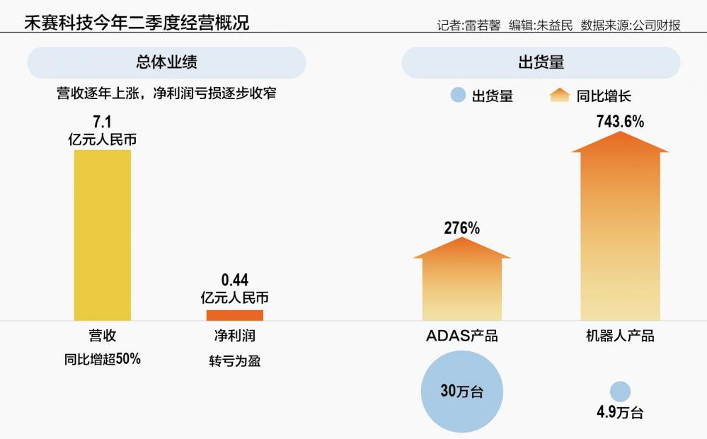 今年二季度,禾賽實現(xiàn)營收7.1億元人民幣,同比增超50%,凈利潤0.44億元人民幣,轉虧為盈。