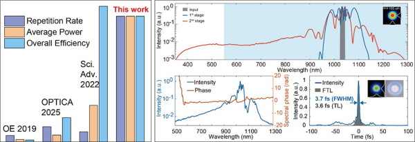 不同單周期脈沖壓縮方案的關(guān)鍵指標(biāo)對(duì)比(左),超連續(xù)白光光譜展寬(右上),接近變換極限的單周期飛秒脈沖壓縮結(jié)果(右下)