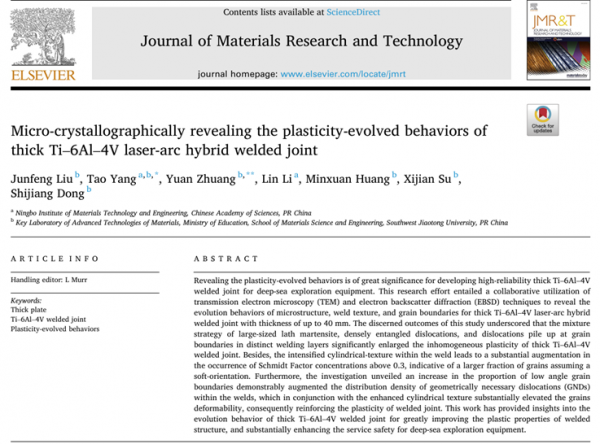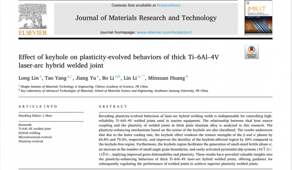 中國科學(xué)院寧波材料所激光極端制造研究中心李琳研究員和楊濤研究員團(tuán)隊(duì)在《Journal of Materials Research and Technology》期刊針對鈦合金厚板焊接連載三篇論文,分別從塑性演變機(jī)制、匙孔效應(yīng)、腐蝕疲勞抗裂性三個(gè)角度揭示了厚板鈦合金焊接接頭的微觀結(jié)構(gòu)與宏觀力學(xué)性能的內(nèi)在關(guān)聯(lián),共同指向“通過微觀結(jié)構(gòu)精準(zhǔn)調(diào)控提升深海設(shè)備焊接接頭可靠性”的核心目標(biāo)。其成果不僅為厚板Ti-6Al-4V焊接接頭的工藝優(yōu)化提供了理論支撐,更為深??碧皆O(shè)備等海洋工程裝備的設(shè)計(jì)安全性奠定基礎(chǔ)。