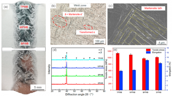 厚板Ti-6Al-4V焊接接頭微觀結(jié)構(gòu)和性能:(a) 接頭橫截面形態(tài);(b) 焊接區(qū)域的金相結(jié)構(gòu);(c)掃描電鏡形態(tài);(d) X射線衍射相位;(e) 不同焊接區(qū)域的拉伸強(qiáng)度和延伸率。