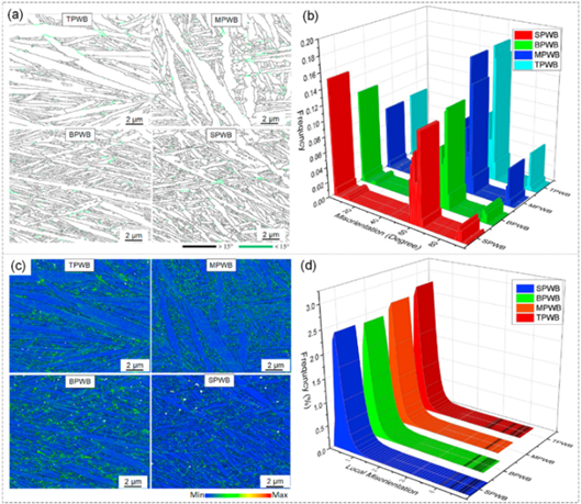 焊縫微觀結(jié)構(gòu)演變和馬氏體片尺寸變化:(a) TPWB中的演變;(b) BPWB中的演變;(c) TPWB中的馬氏體片尺寸;(d) BPWB中的馬氏體片尺寸。