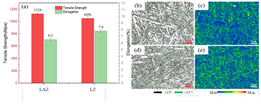 不同焊接區(qū)域的拉伸性能和微觀晶體學(xué)特性:(a) 拉伸性能;(b-c) 激光電弧區(qū)晶體學(xué)特征;(d-e) 激光區(qū)晶體學(xué)特征。