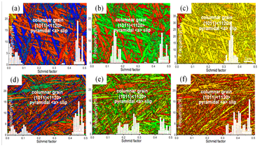 α′相的<11-20>方向的Schmid因子圖和分布: (a-c) 激光電弧區(qū);(d-f) 激光區(qū)。